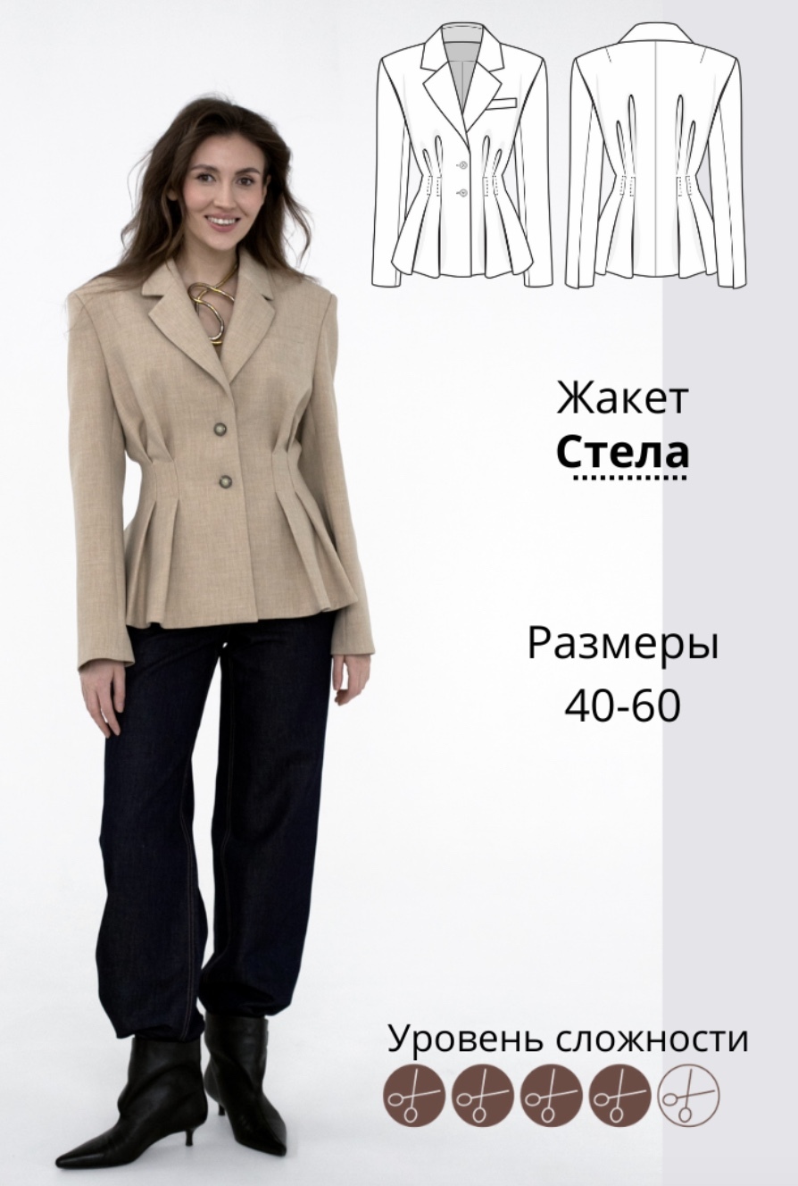Жакет Стела - среднего объема, однобортный. Застежка центральная на 2 пуговицы. Прилегающего силуэта за счет складок по талии. Плечевой пояс расширен, рукав двухшовный, в локтевом шве шлица. В верхней части левой полочки нагрудный карман в листочку. Спинка со швом и плечевыми вытачками.