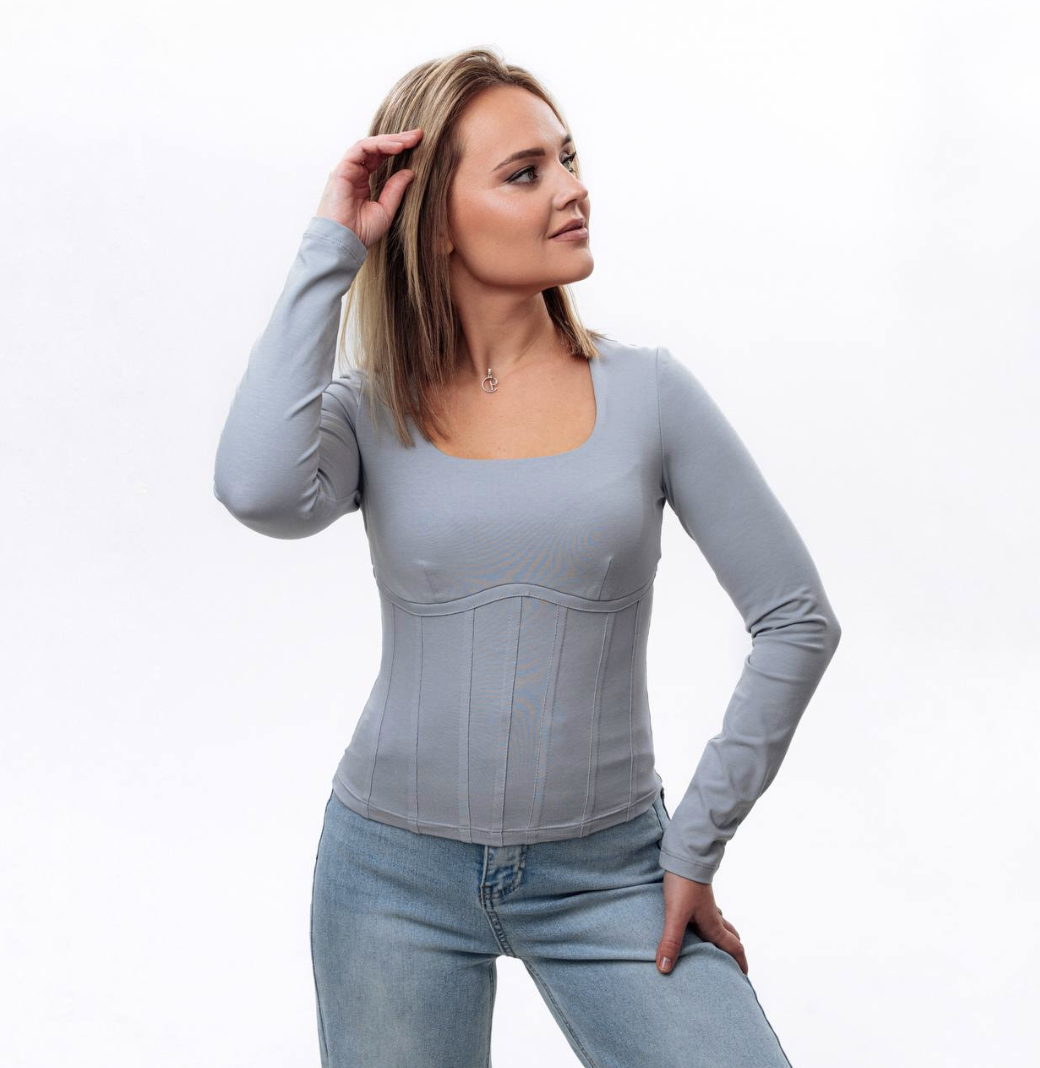 Лонгслив малого объёма, приталенного силуэта. Отрезной под грудью, в шов вставлен кант. Спереди расположены две нагрудные вытачки, в нижней части - вертикальные рельефы-складки (имитация корсета). Вырез горловины мягкой квадратной формы.
